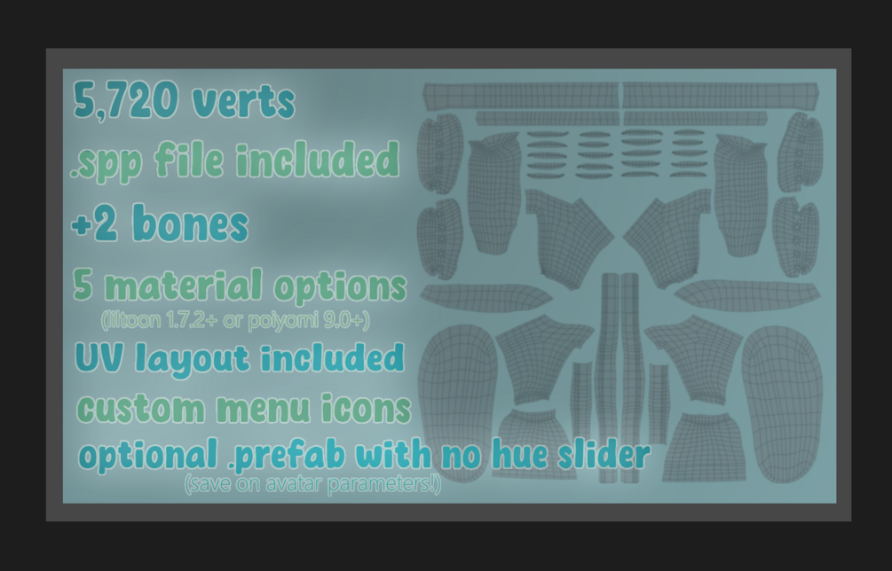 - "Commercial use" here refers to selling an avatar on any online marketplace that has this asset packaged with it, and does not apply to custom commissioned avatars.