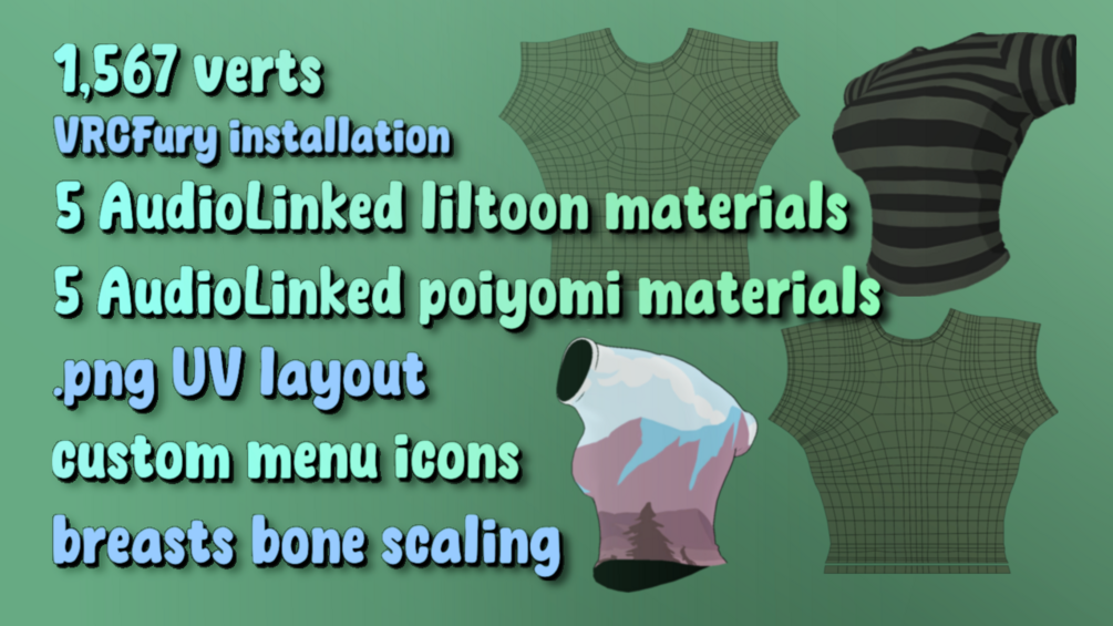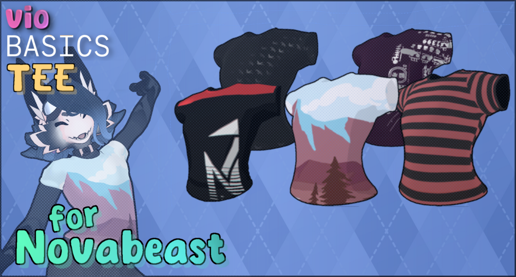 The TEE is the third item from the first batch of the Vio BASICS set! Fitted casual t-shirt with short sleeves, five audiolinked preset materials for either liltoon or poiyomi shader, in-game hue slider, and plenty of blendshapes to layer and style with virtually any outfit.