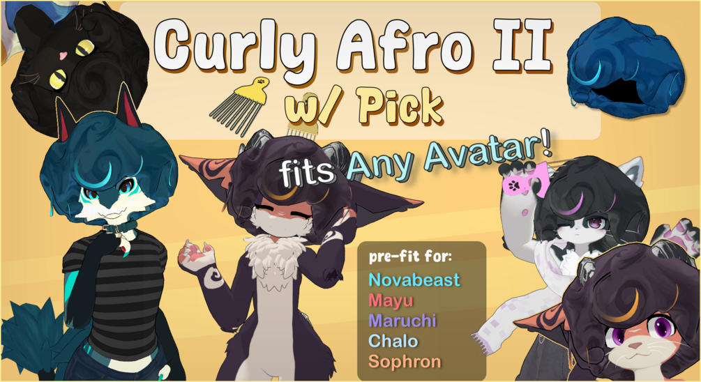 The Curly Fro II is a swirly, curly, poofy, and fluffy hair style that can fit any VRChat avatar base.