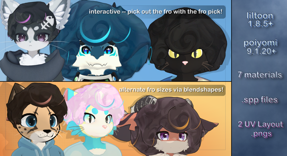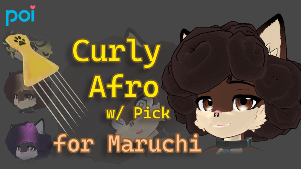 Modeled for the Maruchi base, but can be shaped for other avatars/bases. A version without ear holes is included. Further POC hair assets, and general fashion for VRC planned in the future!
