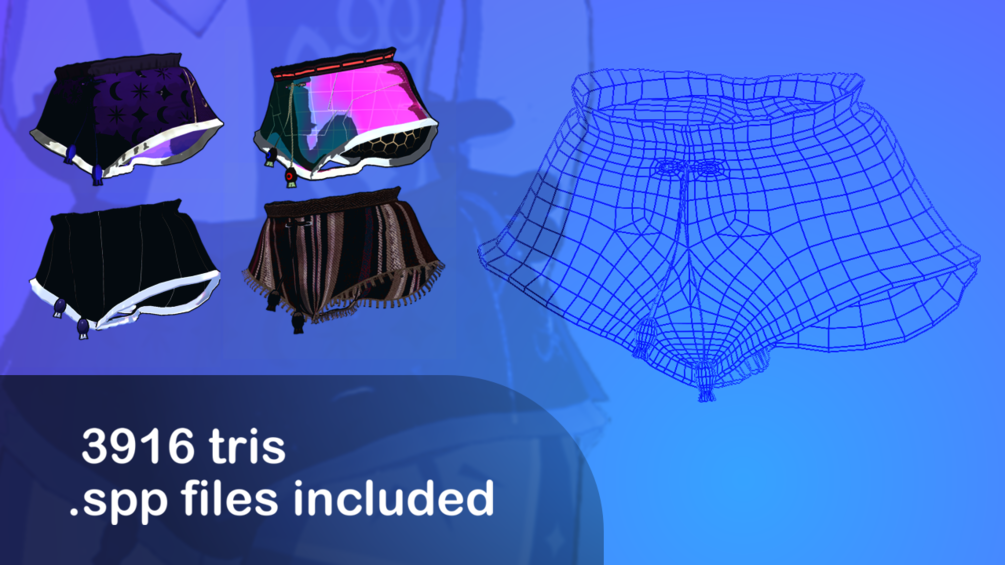 These shorts utilize VRC physbones to simulate a subtle amount of cloth movement, and currently, the prefabs are fit for the Chalo and original Novabeast avatar bases.