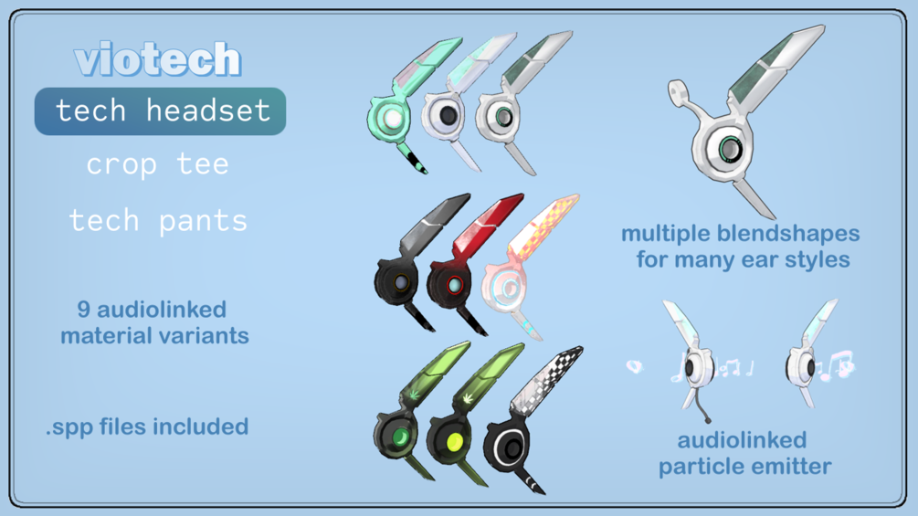 - Wireless mecha-style, headset with various blendshape configurations for optional antenna, and adjustable+removable gooseneck microphone.